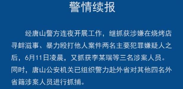 唐山打人案警方已抓獲8名嫌疑人