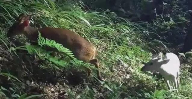 麂,俗稱麂子,其中以黃麂居多,而白麂最為罕見,在我國古代曾被稱為瑞獸。麂子喜歡獨居或者雌雄同棲,主要棲息在小山谷或者雜草叢中,很少會出現群體活動,外出覓食甚至用食過程中,也會隨時留意身邊四周的情況,一有風吹草動就會躲進密林中,能夠拍攝到兩種不同的麂類同框屬實難得。
